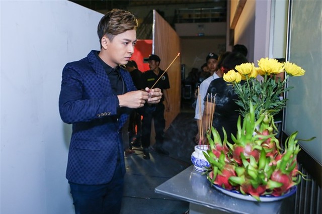 | Ngô Kiến Huy thành tâm khấn Tổ. Trong các live show trước, anh thường rơi vào top nguy hiểm nên chịu nhiều áp lực. |