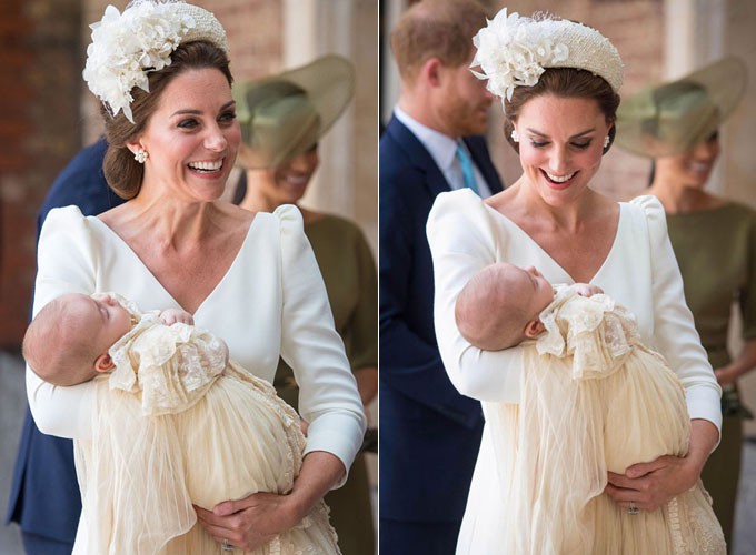 Công nương Kate tươi cười rạng rỡ, nhìn con út đầy âu yếm.