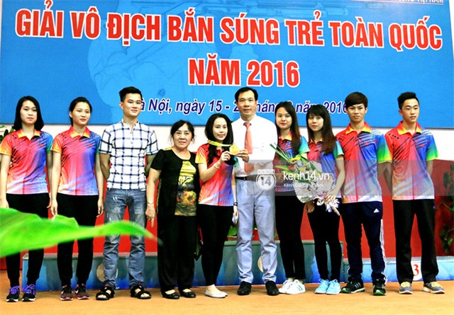 Xạ thủ Hoàng Xuân Vinh trao quà và chụp ảnh lưu niệm với các VĐV trẻ. Anh đang là nguồn cảm hứng, là thần tượng đối với không chỉ riêng những VĐV bắn súng Việt Nam.