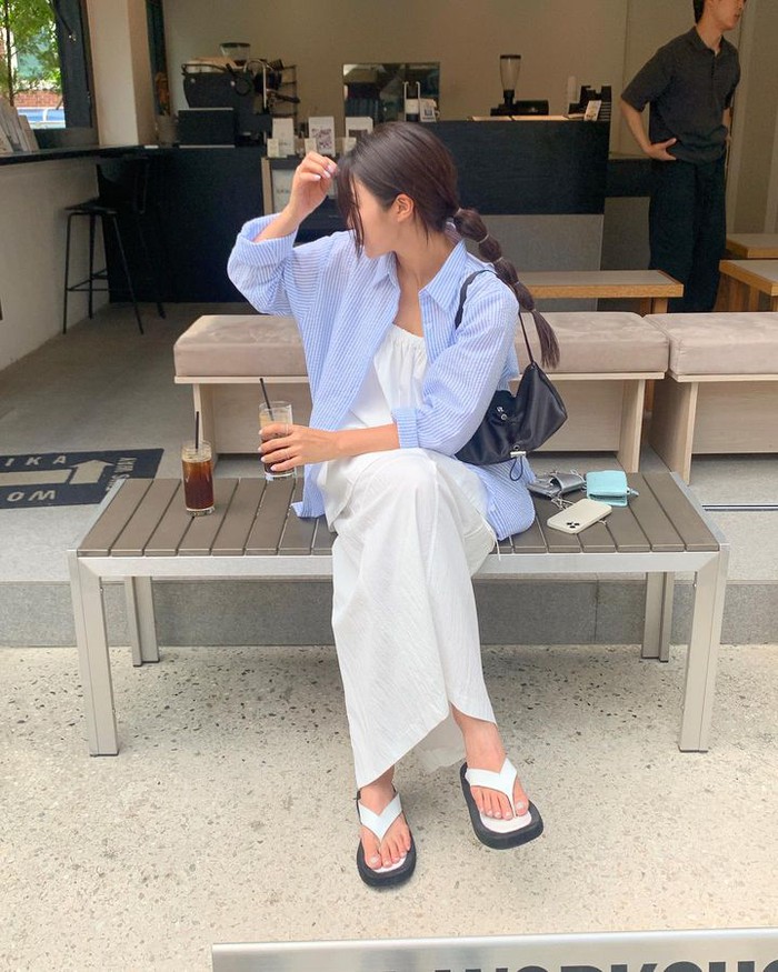 Không gì mát mẻ hơn một set váy thô suông rộng màu trắng kem và set đồ sẽ "ăn điểm" hơn nếu bạn phối thêm áo sơ mi xanh bên ngoài, vừa đúng tiêu chuẩn đồ layer giữa mùa hè, vừa giúp chống nắng tối đa