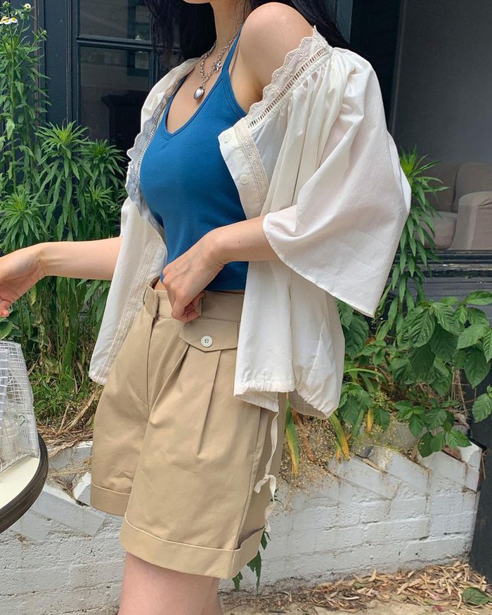 Áo blouse khi layer cùng áo hai dây, quần short khaki cũng sẽ thành một tổ hợp hay ho đó nha!