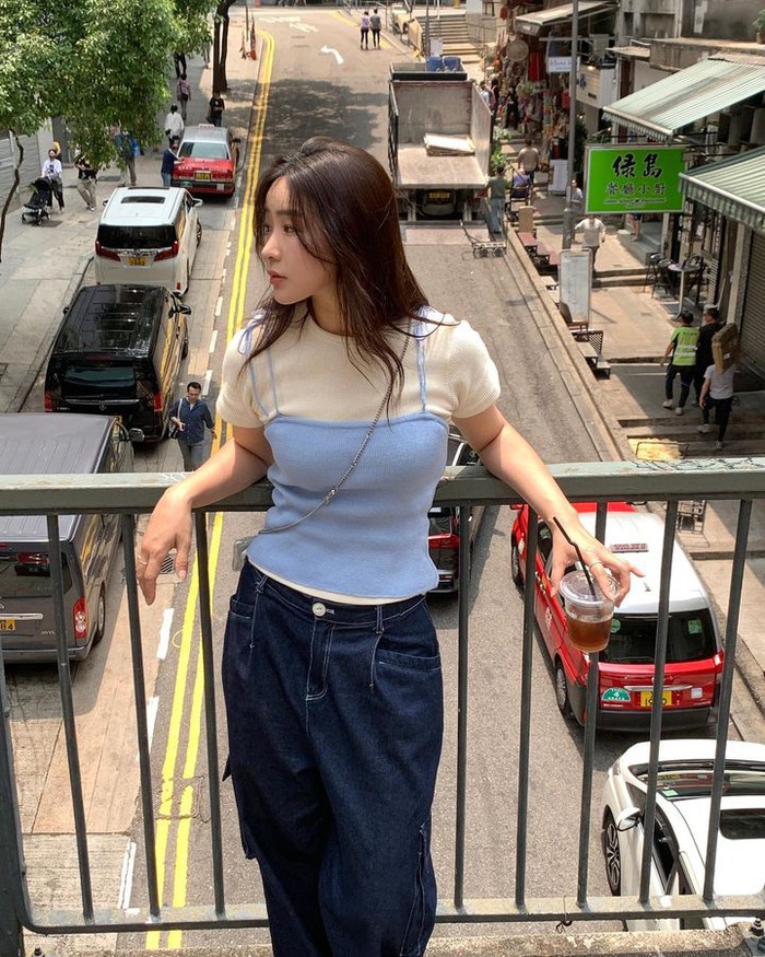 Ai thích áo hai dây nhưng ngại mặc hở thì có thể layer em nó với babytee bên trong rồi mix cùng quần túi hộp/chân váy dài