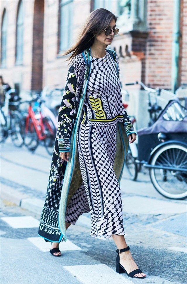 Họa tiết hình học trừu tượng của áo khoác, váy áo sẽ xua tan cái se lạnh của mùa thu.