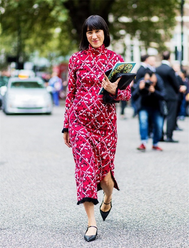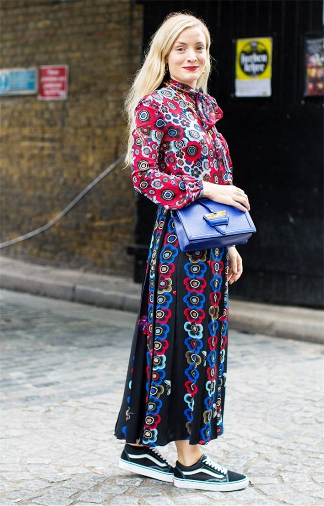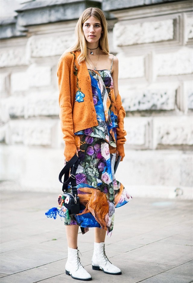 Họa tiết hoa mùa hè tinh túy (trên nền trắng) có thể được áp dụng vào mùa thu khi phối với chiếc áo dài tay màu đỏ.