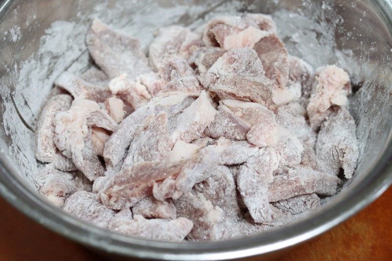 Bước 4: Thêm 3 thìa canh tinh bột vào bát thịt rồi trộn chung sao cho bột phủ đều miếng thịt.