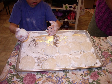 Một bé trai đang tự tay giúp mẹ xoa bột những chiếc bánh cho mẹ.