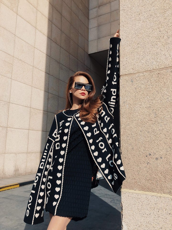 Ca sĩ Hồ Ngọc Hà tạo ấn tượng với styles khi lựa chọn tông đen chủ đạo, khoác ngoài thêm chiếc áo họa tiết làm nổi bật cả set đồ.