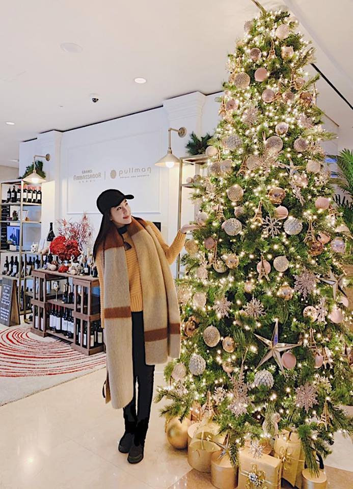 Bảo Thy xinh đẹp trong chiếc áo len màu vàng quấn thêm một chiếc khăn len ở cổ trong chuyến du lịch đến Hàn Quốc.