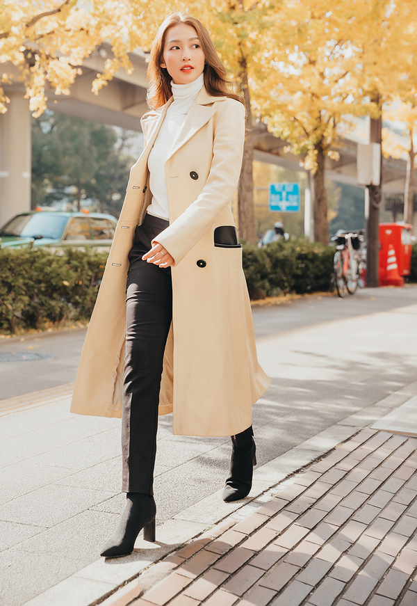Khánh Linh lựa chọn áo len cổ lọ phối chân váy và boots da tiệp màu đen, thêm áo khoác dáng dài tông nâu trầm.