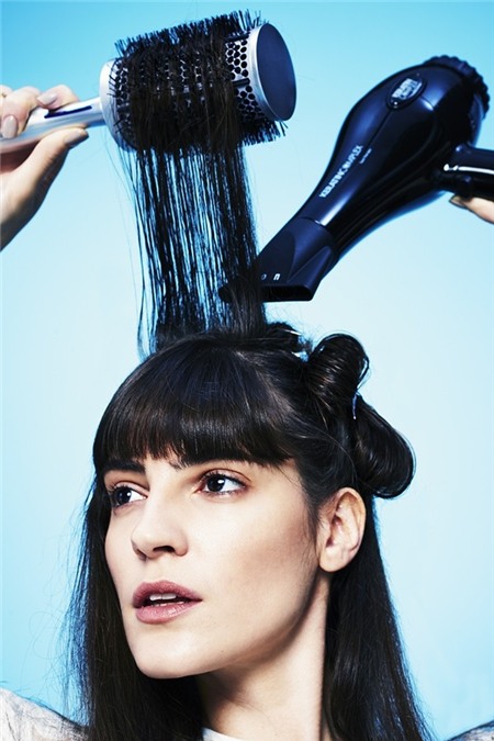 Bước 3: Công đoạn thú vị nhất sẽ bắt đầu, hãy khởi động ngay bằng những phần tóc mái dễ khô trước, bạn sẽ không hề muốn không khí khô phá hỏng mái tóc này. Xịt qua phần tóc của bạn bằng sản phẩm bảo vệ tóc khỏi nhiệt độ, sau đó hướng máy sấy vào phần chân tóc, đừng quên kết hợp cùng một chiếc lược phẳng, chải theo nhiều hướng khác nhau để tạo sự bồng bềnh, tự nhiên.
