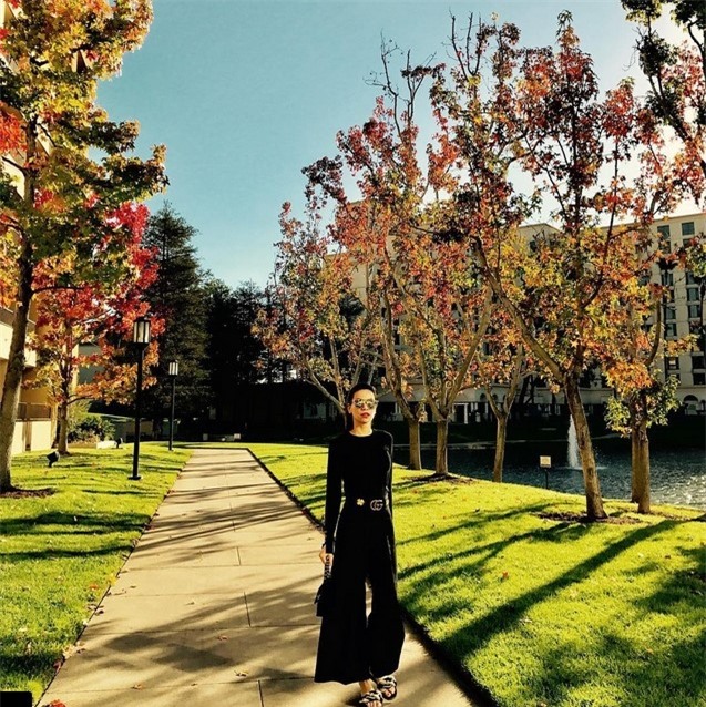 Thời trang dạo phố của người đẹp nổi bật với cây jumpsuit đen và điểm nhấn là thắt lưng mặt kim loại giúp tạo ánh sáng cho trang phục.