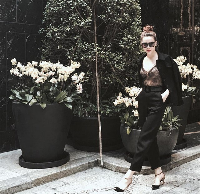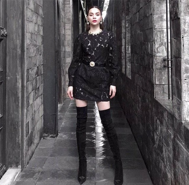 Váy ren đen được cô kết hợp cùng bốt ngang đùi và thắt lưng mặt tròn giúp tạo phong thái sang trọng, huyền bí.