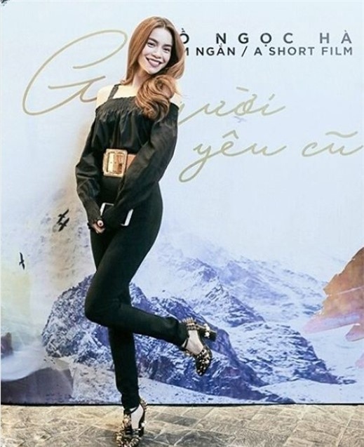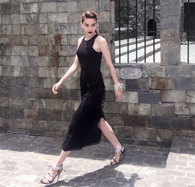 Với đầm đen, Hà Hồ giúp nó trở nên thu hút nhờ mẫu giày đan dây cũng như họa tiết đính đá nổi bật cho trang phục.