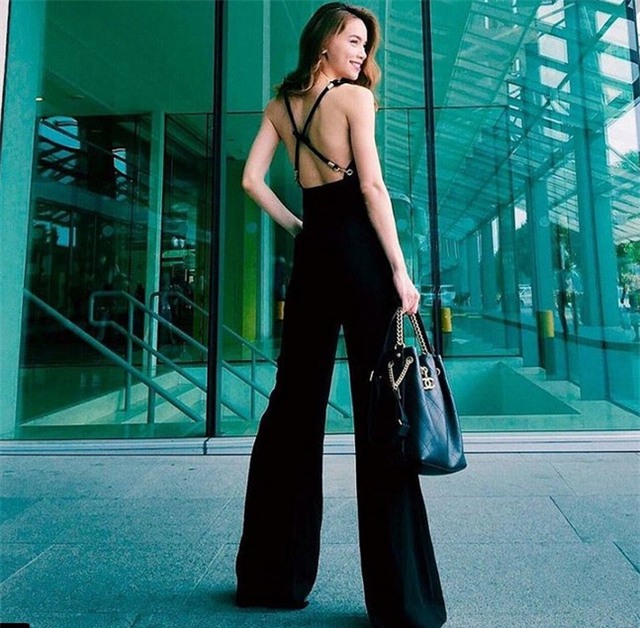 Jumpsuit đen với khoảng lưng hở hấp dẫn khoe thế mạnh hình thể của người đẹp.