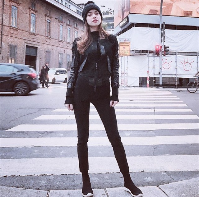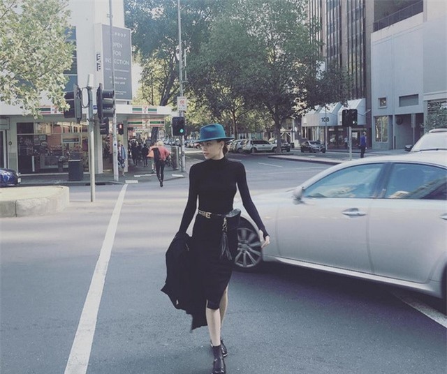 Cũng với cây đen nhưng bộ váy len của Hà Hồ trở nên trẻ trung hơn hẳn với sneaker trắng năng động.
