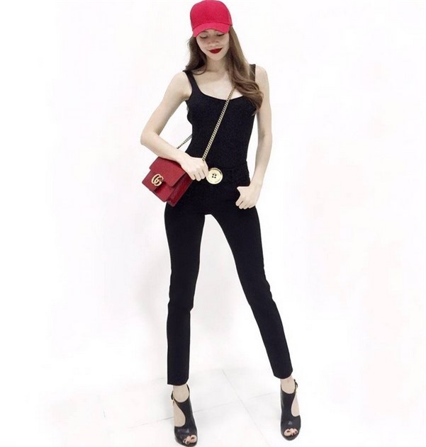 Hà Hồ khéo léo phối cây đen với phụ kiện mũ và túi tông đỏ rực rỡ, giúp màu đen không còn nhàm chán.