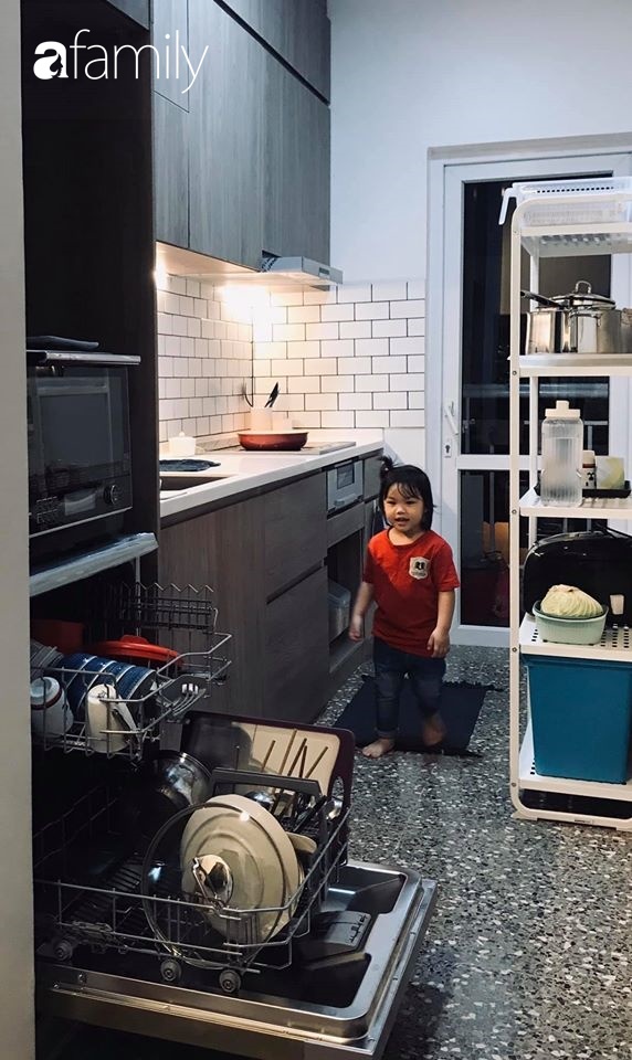 Hút mùi bếp và bếp từ chị mua của Panasonic vì tiếng ồn máy chạy nhỏ, cực kì dễ vệ sinh. Thêm một chiếc lò nhỏ nướng đồ ăn. Chị Phương cũng khuyên chị em nên tính tới không gian máy rửa bát. Vì thời gian đầu thiết kế chị không quan tâm lắm, đến khi mua về phải dịch chuyển tủ lạnh để cho hợp lý.