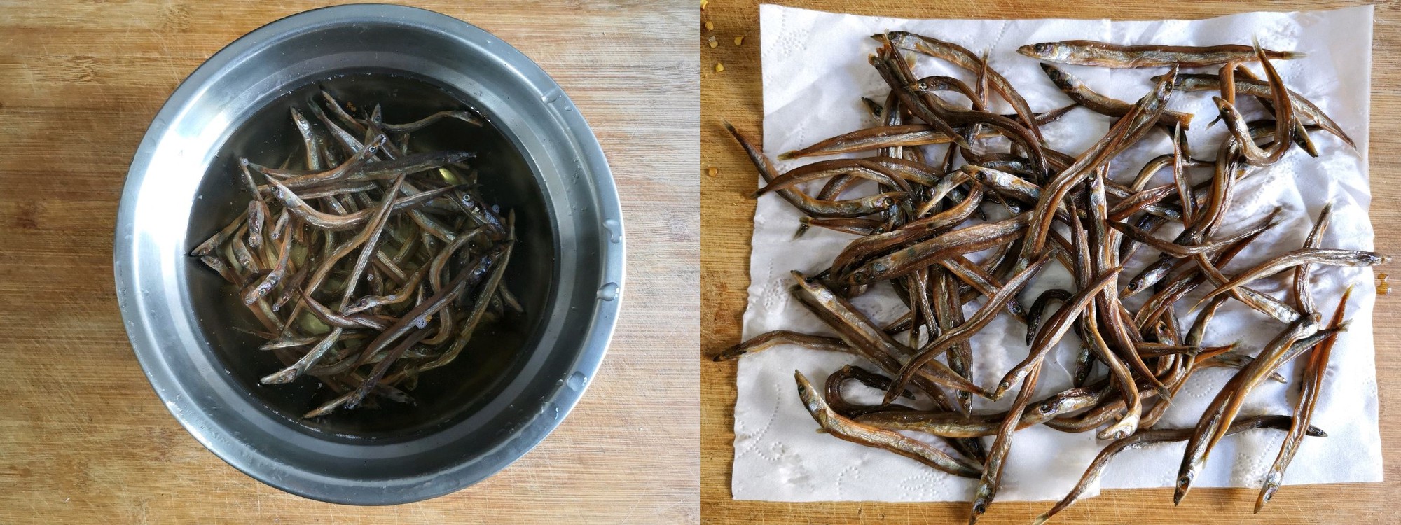 Cá khô rửa sạch ngâm khoảng 1 giờ cho mềm. Vớt cá khô ra rồi thấm khô nước.