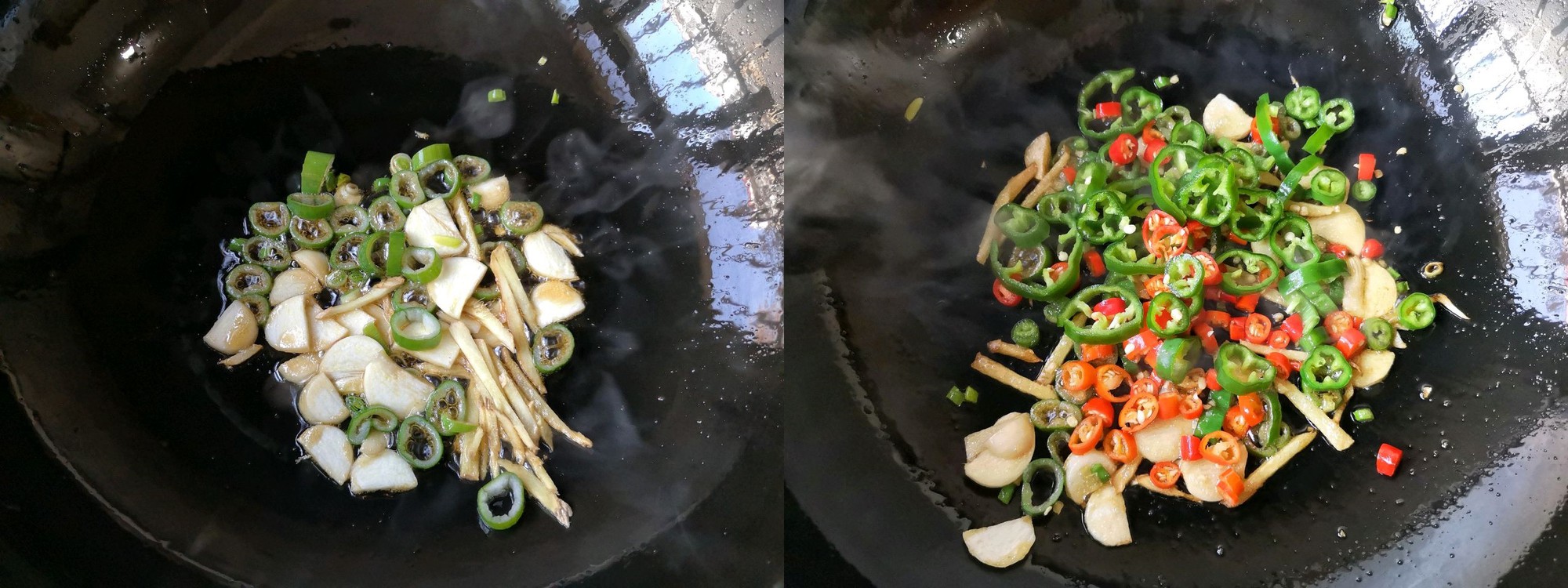 Đun nóng một ít dầu ăn trong chảo, đổ tỏi hành và gừng vào xào thơm sau đó thêm ớt xanh, ớt hiểm vào đảo qua.