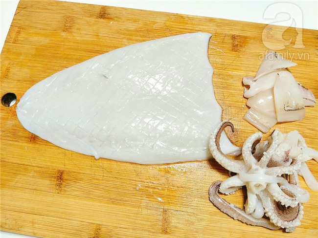 Mực moi bỏ nội tạng rồi bóc màng da mực rửa lại sạch sẽ, khứa mực thành hình vẩy rồng hoặc bạn có thể cắt khoanh nhé, phần đầu mực để nguyên.