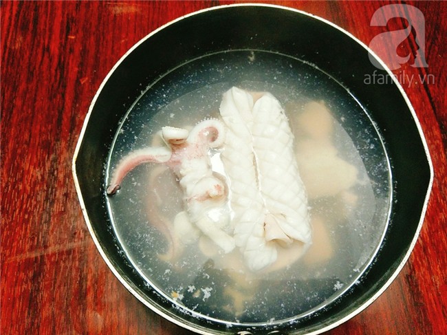 Đun 1 ít nước sôi sau đó bạn cho mực vào luộc sơ qua cho mực vừa chín thì vớt ra.