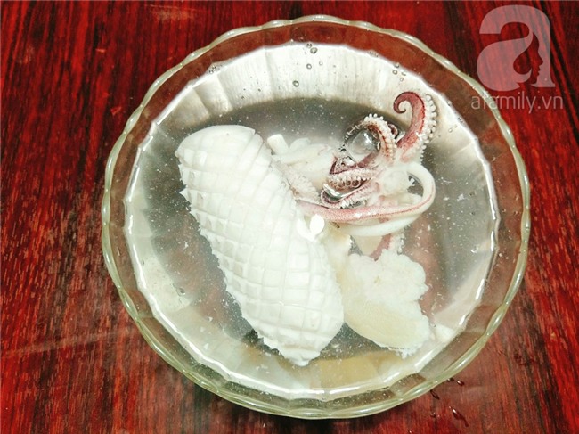 Thả mực vào tô nước đá lạnh ngâm vài phút cho mực giòn, vớt ra và thái mực thành những miếng vừa ăn.