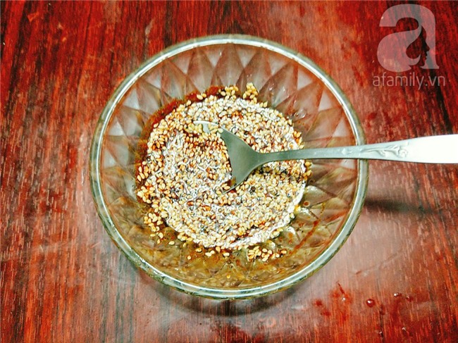 Cho các gia vị: nước tương, dầu mè, vừng trắng, tiêu, đường, ớt bột, tỏi băm vào 1 cái bát và trộn đều nguyên liệu.