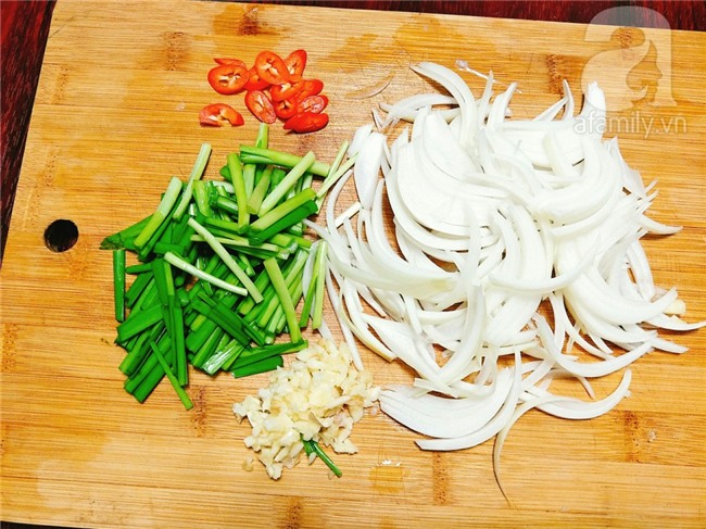 Ớt sừng thái lát mỏng, hẹ rửa sạch thái khúc, hành tây thái sợi.