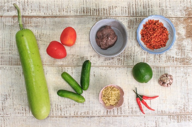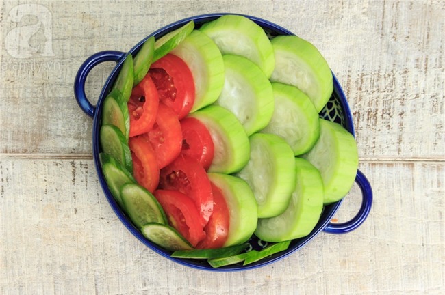 Bào vỏ, cắt khoanh và luộc chín bầu. Cắt lát cà chua, dưa leo.
