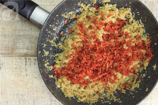 Khi tỏi và sả đã dậy mùi, cho tép sấy vào phi chung.
