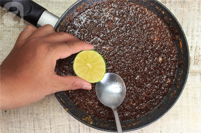 Hòa 100ml nước sạch cùng 40g đường và 15ml nước cốt chanh vào, xào thêm khoảng 3 phút thì tắt bếp.