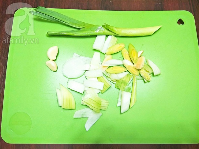 Hành boa rô rửa sạch, thái miếng vát chéo, tỏi bóc vỏ, đập dập, hành tây thái miếng vừa nhỏ.