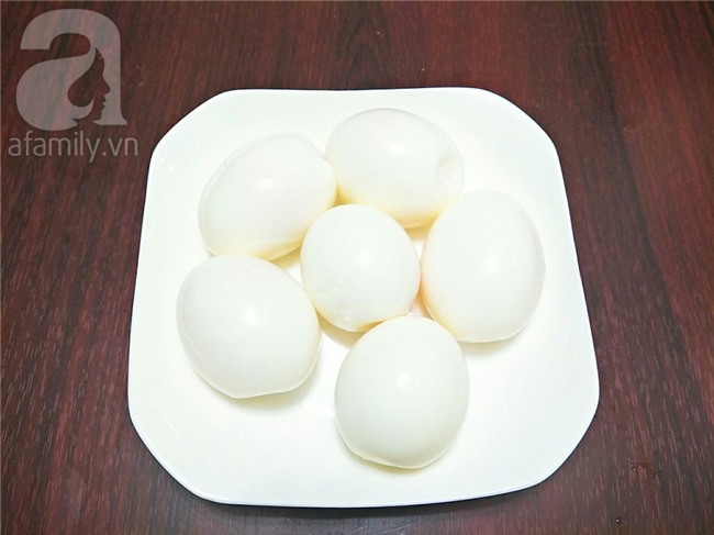 Vớt trứng gà ra tô nước lạnh, ngâm 10 phút cho trứng nguội thì đem bóc sạch vỏ trứng.