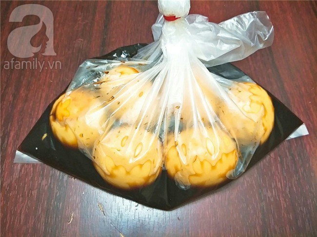 Cho trứng vào 1 cái túi nilon dầy 1 chút, hoặc bạn cho vào hũ thủy tinh cũng được, rót nước tương đã nguội vào túi trứng, buộc chặt và cho vào 1 cái bát, ngâm 6-8 tiếng trong ngăn mát tủ lạnh là trứng ngấm gia vị.