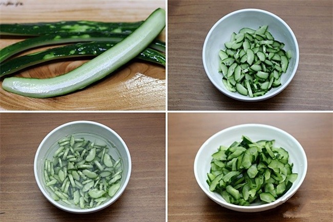 Dưa chuột thái lát mỏng, ngâm trong nước muối pha loãng khoảng 20 phút sau đó rửa sạch lại với nước lạnh. Để dưa cho ráo nước.
