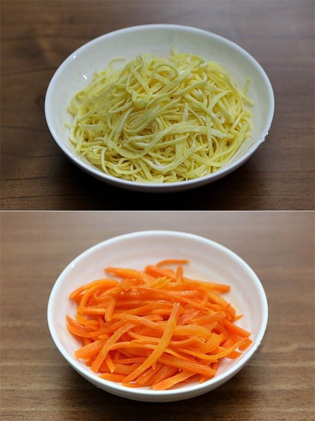 Trứng đánh tan với một ít muối rồi chiên chín, thái trứng thành sợi. Cà rốt bào sợt rồi xào chín với một ít muối.