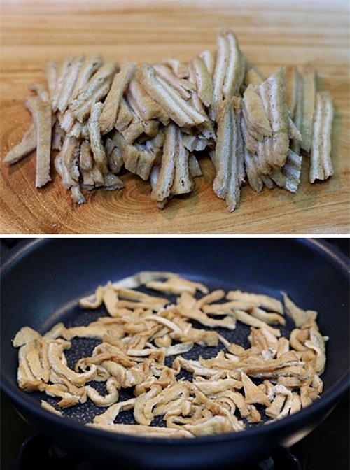 Đậu phụ chiên thái lát sau đó được xào qua với chút gia vị.