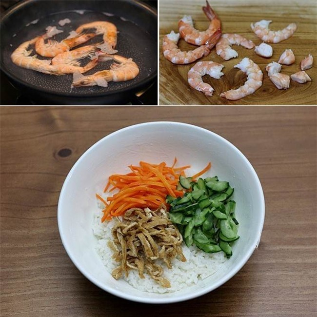 Luộc chín tôm với một ít rượu gạo sau đó bóc bỏ vỏ tôm. Cho cơm ra bát tô, thêm cà rốt, dưa chuột, đậu phụ vào trộn đều