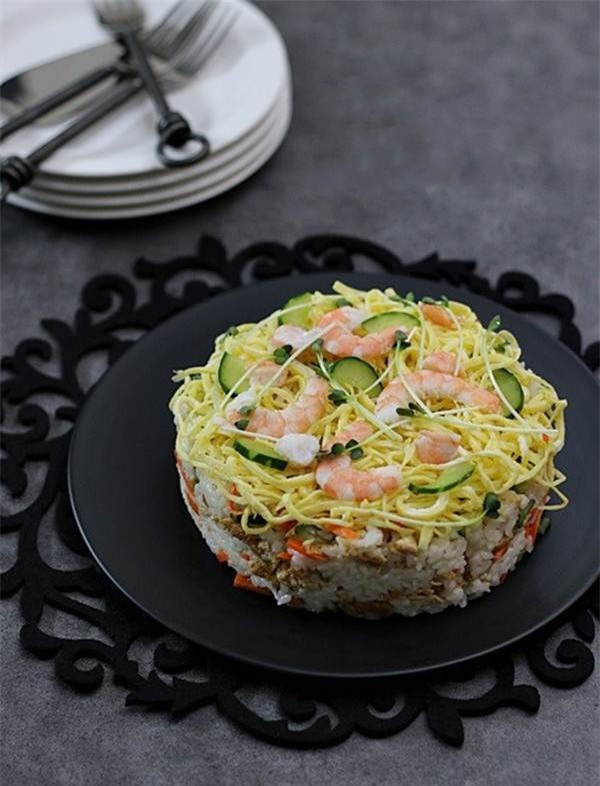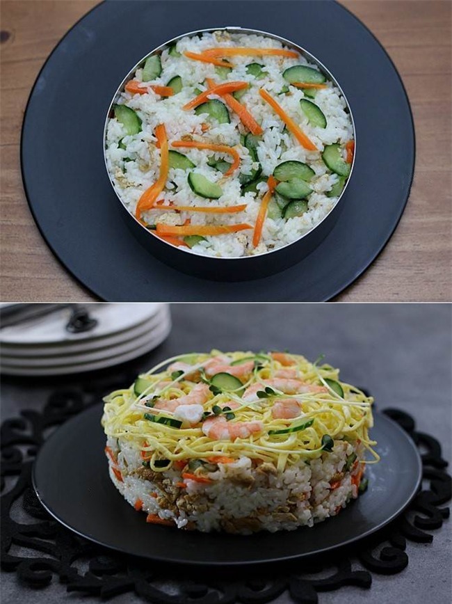 Đặt khuôn tròn trên đĩa, cho cơm đã trộn vào ép chặt. Xếp trứng đã thái sợi lên trên cùng với tôm và rau mầm là xong.