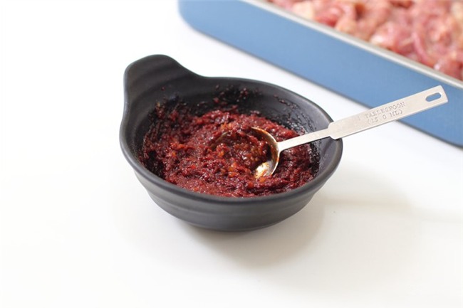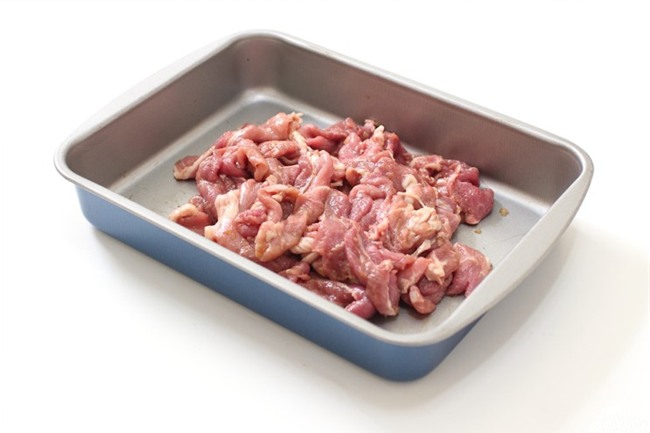Thịt lợn thái miếng vừa ăn, trộn thịt với phần gia vị ướp thịt.