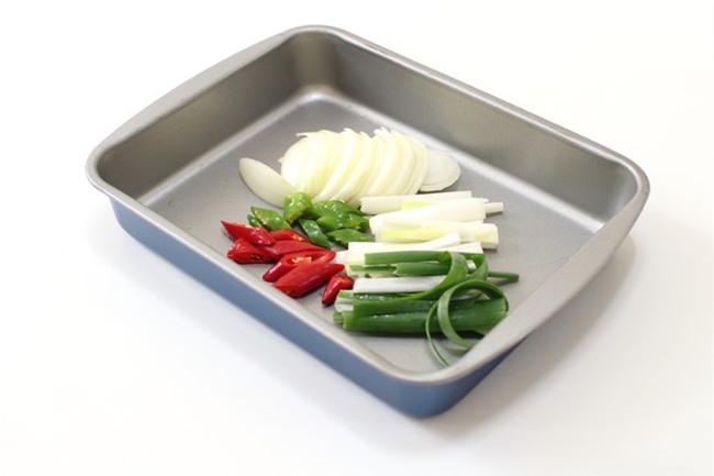 Hành tây, ớt xanh, ớt đỏ thái lát. Hành lá thái khúc.