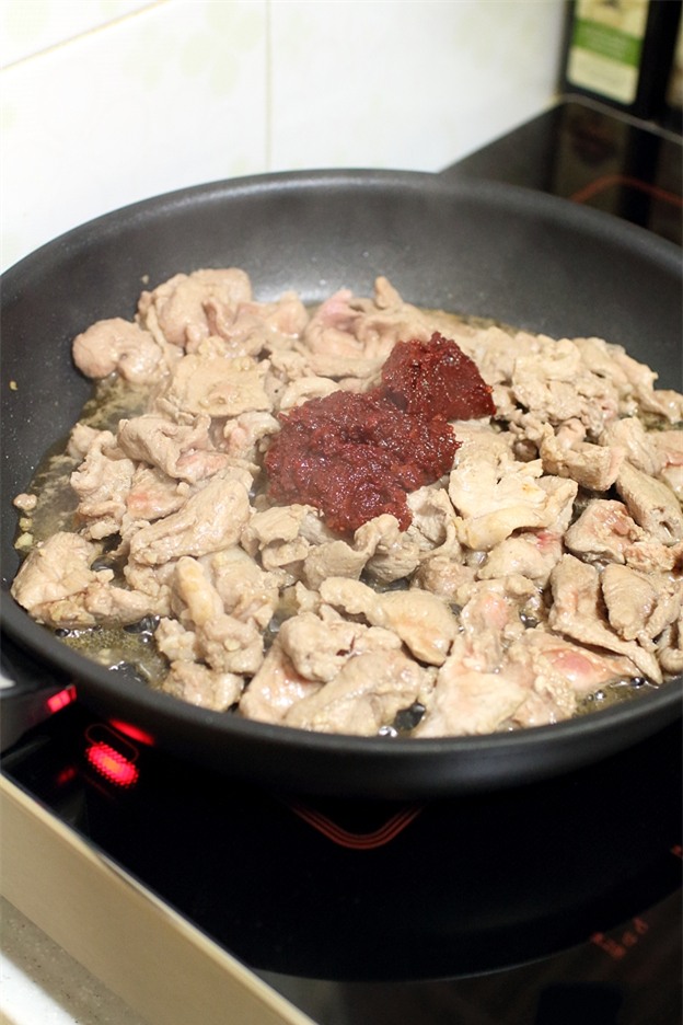 Cho một ít dầu ăn vào chảo đun nóng, cho thịt vào xào săn. Tiếp đó cho phần gia vị sốt đã trộn vào đảo đều cho thịt ngấm gia vị.