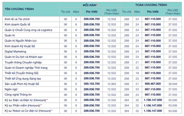 - Các ngành khác hệ đại trà: 276.000đ/tín chỉ (chương trình toàn khóa 142 tín chỉ).