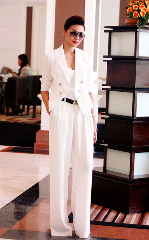 Hãy học sao Việt cách mix đồ trắng từ trong ra ngoài, từ trên xuống dưới để trở nên nổi bật hơn.