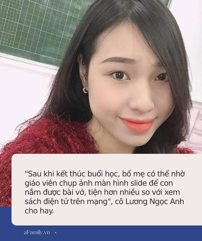 Nên sau khi kết thúc buổi học, bố mẹ có thể nhờ giáo viên chụp ảnh màn hình slide để con nắm được bài, tiện hơn nhiều so với xem sách điện tử trên mạng. Trong tình hình học sinh chưa nhận được sách giáo khoa như hiện tại thì các cô buộc phải làm điều đó. Phụ huynh không cần quá lo lắng".