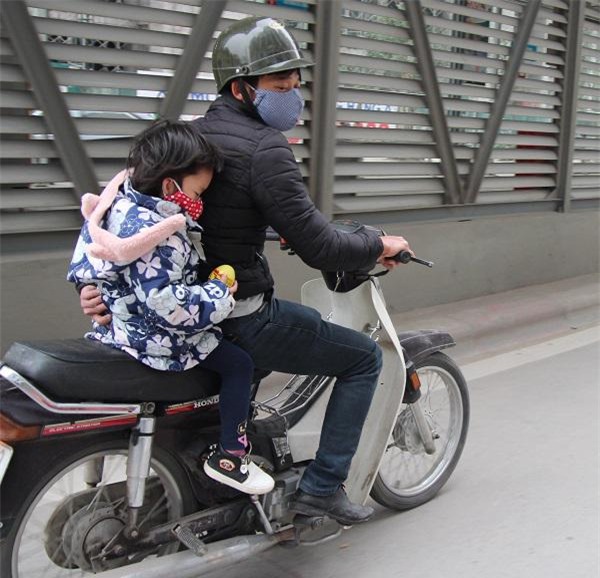 Một số trẻ vừa đi vừa ngủ trên xe, mặc dù thời tiết rất lạnh.