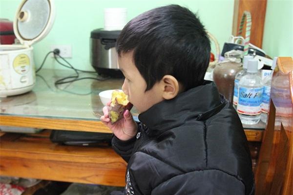 Khi mẹ không có nhà, cháu Minh phải ăn tạm đồ ăn vặt ở nhà đợi mẹ về nấu bữa trưa.