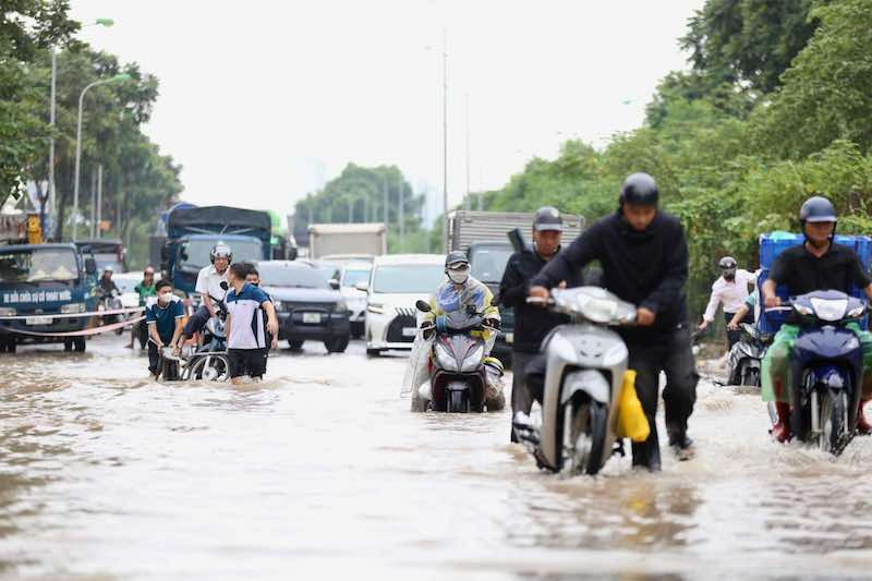 Trưa nay, con gái chị Nhung (gần Thiên Đường Bảo Sơn, Hoài Đức, Hà Nội) mới đi học một đoạn đã phải quay về vì đường ngập sâu, nhiều xe chết máy phải dắt bộ. “Quãng đường đi học của con dài 6km, phải đi ngang một khu biệt thự, vượt qua Đại lộ Thăng Long rồi đi đường 70 - đều là những ‘con đường đau khổ’ ngập sâu. Tan học chiều qua, con đi hơn một tiếng mới về được tới nhà vì mưa lớn, đường ngập. Hôm nay, con rời nhà từ 11h45 dù gần 13h mới bắt đầu vào học, nhưng cuối cùng đi được hơn 1km đã phải quay về khi xe chết máy, phải dắt lội bì bõm”, chị Nhung chia sẻ.
