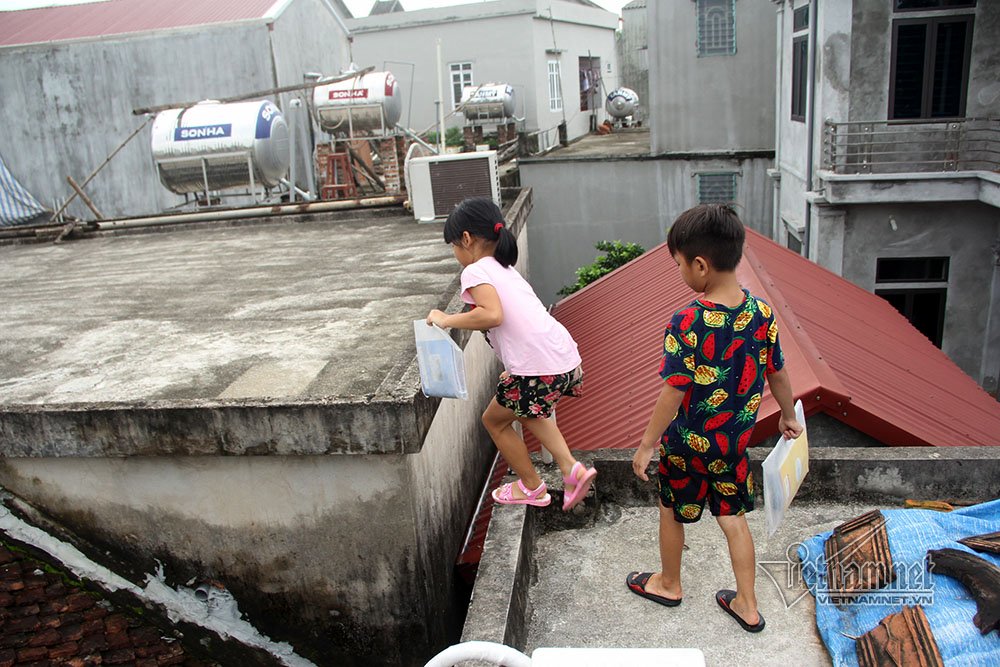 Em Nguyễn Văn Dự và Nguyễn Thị Yến học cùng lớp 3 với nhau. Nhà các em cũng bị ngập sâu không thể đi bộ vào được, không trèo cây được như các anh chị lớn, 2 em phải leo lên sân thượng nhà mình, trèo qua ít nhất 5 nóc nhà, sau đó lội nước 1 đoạn để ra tới đầu làng đi ca nô.