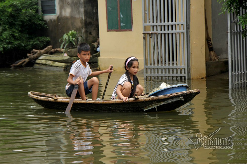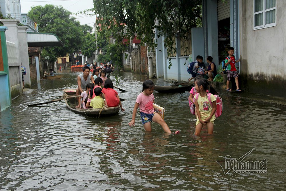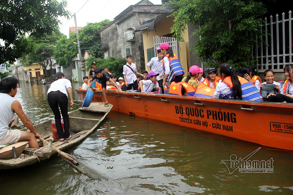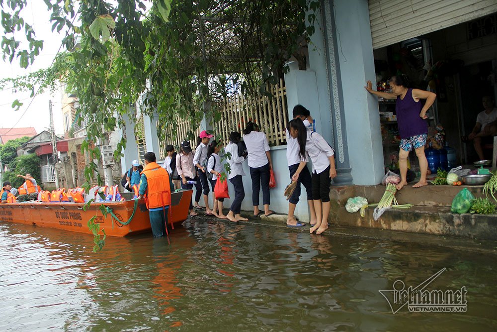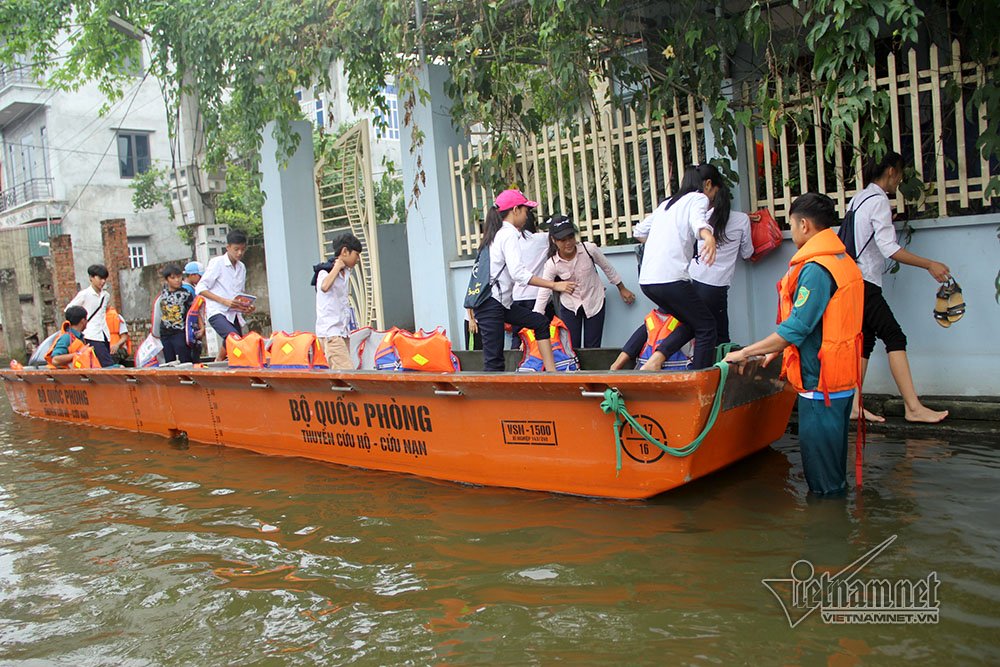 Ca nô đưa đón học sinh ngoại thành Hà Nội đi học ngày lũ